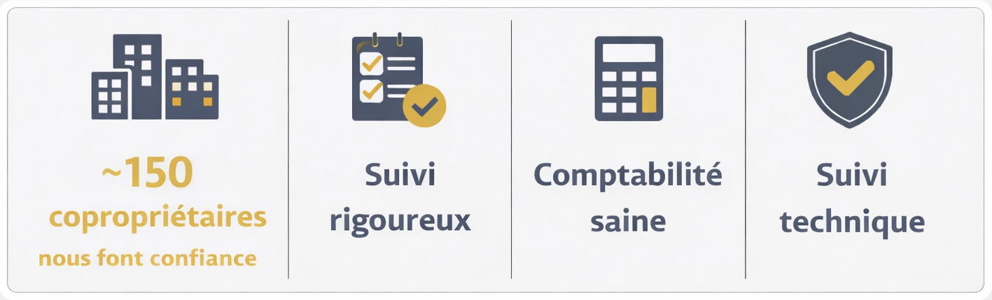 Plus de 150 copropriétaires nous font déjà confiance, certaines depuis plusieurs décennies, et de nouvelles résidences nous rejoignent régulièrement grâce à la qualité de notre suivi et de nos services.