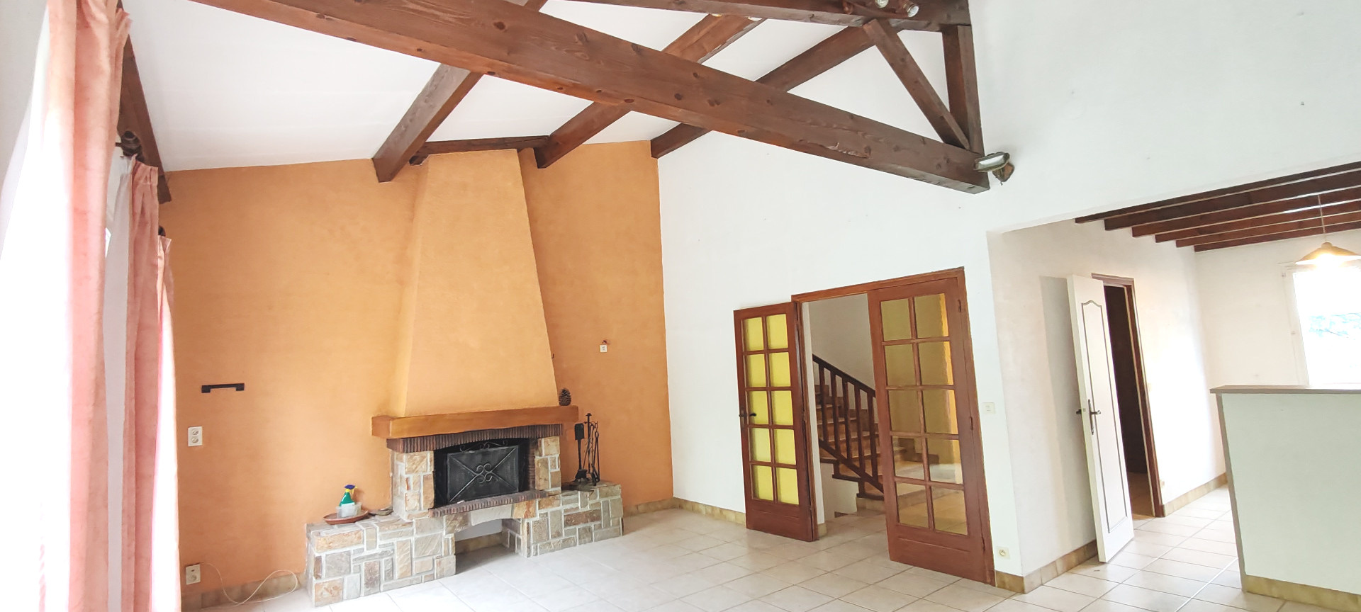 Concernant la partie habitation un vaste hall d'entrée desservant la cuisine aménagée et équipée ouverte sur une belle et lumineuse pièce de vie avec ses poutres apparentes et sa cheminée , accès direct à la terrasse.